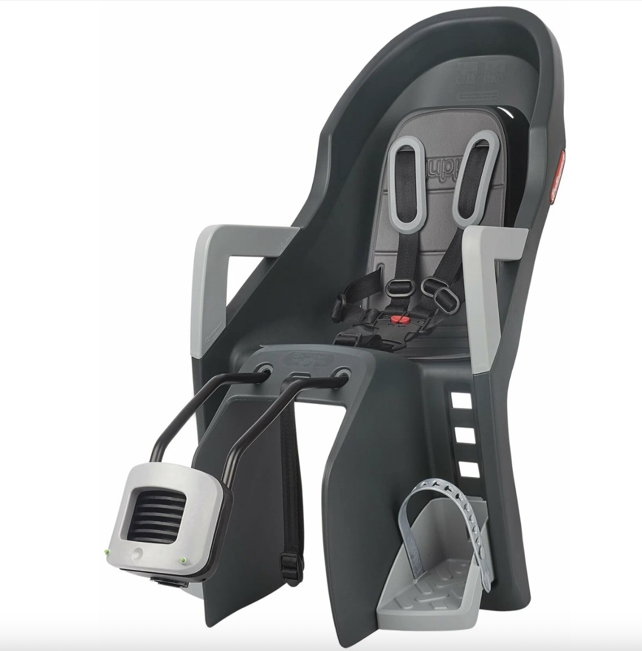 Guppy RS + FF - легкое в использовании детское кресло от Polisport. Корпус кресла выполнен из прочного пластика и покрыт специальным мягким матрасиком. Он обеспечивает мягкую посадку, отличную амортизацию, приятные тактильные свойства, легкую мойку и влагоустойчивость. Вес кресла 5,73 кг. Пятиточечный ремень мягко и надежно фиксирует ребенка по всему корпусу тела, мягкие вставки ремней не натрут и не нарушат комфорт посадки, а пряжка защищена от самопроизвольного расстегивания ребенка в пути. Подножки легко поддаются регулировке в 4 положениях под рост ребенка, допуск от 9 месяцев до 5 лет и весом до 22 кг. В модели предусмотрены подлокотники и специальные щитки, которые предотвращают контакт с колесом, обеспечивая дополнительный уровень безопасности. Фиксатор установится на рулевой стакан рамы между верхней и нижней трубой рамы. Для безопасности движения советуем учесть к выбору шлем для ребенка, например MET Super Buddy. Кресло рассчитано на велосипеды с размером колес 26"-28" и совместимо с трубами размером 28–40 мм. Кресло прошло испытания и показало достойный уровень безопасности и комфорта, за что теперь может похвастаться Европейским сертификатом качества EN 14344.